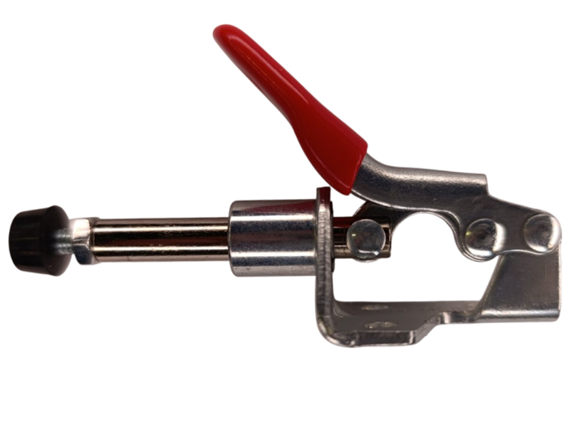 Принцип действия и отличие от других типов. Это прижим толкающего действия. В отличие от вертикальных или горизонтальных моделей, которые давят на деталь сверху, этот прижим толкает ее вперед по прямой линии. Это идеально для задач, где нужно плотно прижать заготовку к боковому упору, зафиксировать ее в углу кондуктора или в условиях ограниченного по высоте пространства. Когда рукоятка находится в горизонтальном положении, прижимной шток полностью втянут. При поднятии рукоятки в вертикальное положение, система рычагов выдвигает шток вперед на 17 мм, создавая толкающее усилие.