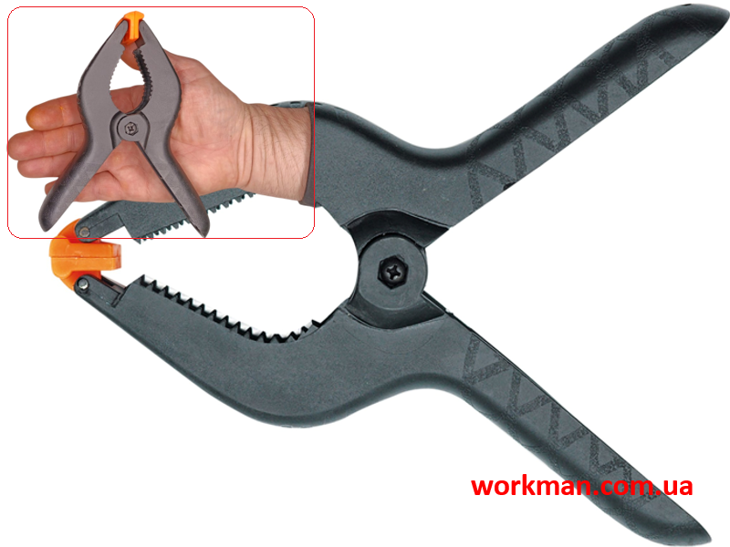 Когда масштаб задач растет, стандартные зажимы перестают справляться. Для быстрой фиксации широких досок, габаритных деталей или для крепления укрывных материалов требуется инструмент с большим раскрытием губок. Струбцина-прищепка WorkMan PP 165 мм — это мощный и крупный пружинный зажим, который сочетает внушительный захват с фирменной скоростью и удобством. Он создан для тех моментов, когда нужно быстро и надежно зафиксировать то, что не под силу зажимам поменьше.