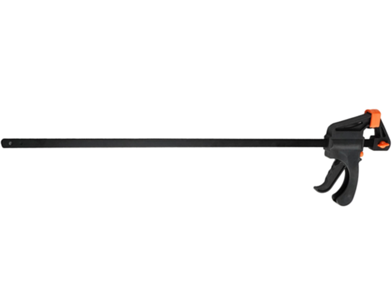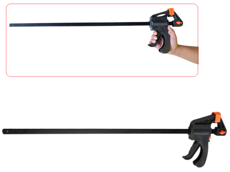 - Сверхдлинная и жесткая стальная штанга. Направляющая штанга длиной более 60 см изготовлена из прочной углеродистой стали с усиленным профилем. Это обеспечивает высокую устойчивость к изгибу, благодаря чему прижимное усилие остается равномерным по всей длине зажима, что критически важно для получения плотных и ровных соединений на больших деталях.