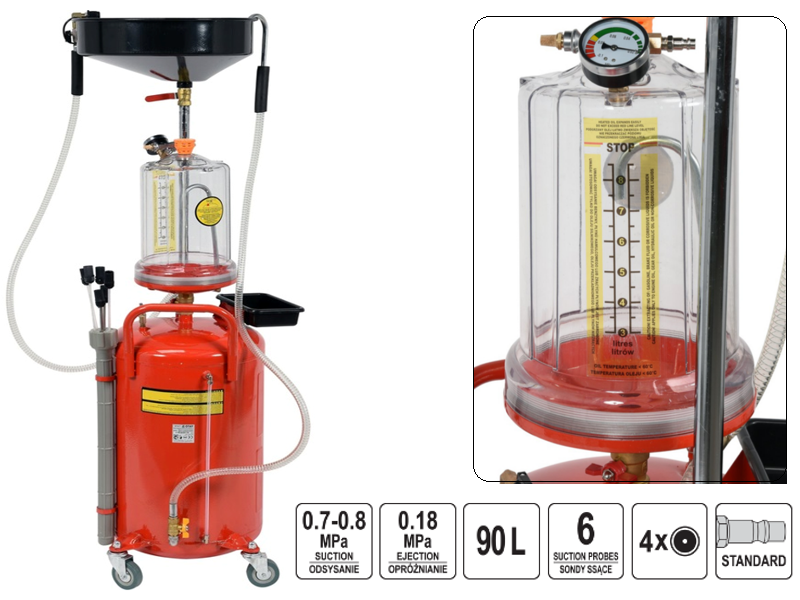 - Два способа работы: универсальность в действии. Аппарат предлагает два режима. **Традиционный слив:** большая 10-литровая воронка на регулируемой по высоте штанге позволяет удобно собирать отработанное масло через сливную пробку картера. **Вакуумная откачка:** при подключении к компрессору, установка создает мощный вакуум, который через один из 6 специальных щупов быстро и чисто удаляет масло через трубку масляного щупа. Это идеальный метод для экспресс-замены или для автомобилей, где доступ к сливной пробке затруднен.