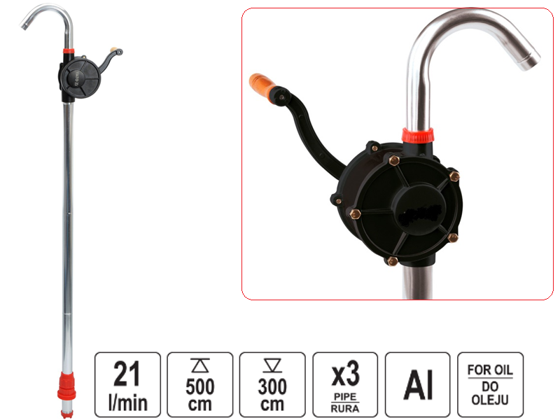 - Рекордная глубина всасывания — 3 метра. Ключевое преимущество этой модели — способность создавать сверхглубокий вакуум. Это достигается за счет высокоточной подгонки деталей роторного механизма с минимальными допусками. В результате насос может поднимать жидкость с глубины до 3 метров, позволяя откачивать топливо или масло из почти пустых заглубленных цистерн, куда не достанет ни один другой ручной насос.