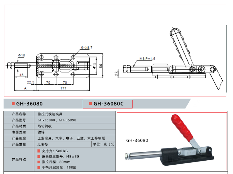 У серійній роботі, чи то зварювання, столярна справа або збирання, швидкість і надійність фіксації вирішують усе. Як забезпечити миттєвий, потужний і, що важливо, лінійний притиск невеликої заготовки в кондукторі? Для цих завдань і створений штовхаючий (поршневий) затискач WorkMan GH-36080C. Його мета — одним рухом рукоятки висунути поршень, намертво зафіксувати деталь із зусиллям 580 кг і так само швидко звільнити її для наступної операції.