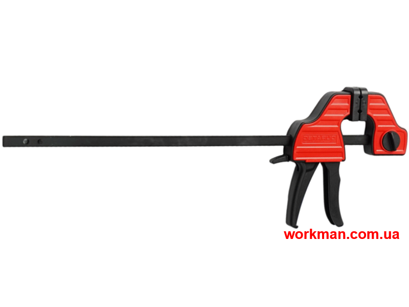 - Потужний одноручний механізм. Головна перевага цієї струбцини — можливість притримувати заготовку однією рукою, а другою — миттєво її затискати. Пістолетний механізм забезпечує потужне та контрольоване зусилля стиснення, достатнє для надійної фіксації деталей при склеюванні, свердлінні або складанні.