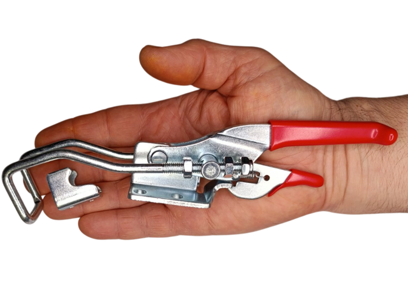 Мене звати Іштван Сабо. Притиск з прямою скобою — відмінний базовий інструмент. Але в моїй майстерні частіше затребувана саме ця, версія з вигнутим гаком, тому що більшість реальних виробів мають якісь бортики, виступи, нерівності. Нещодавно я робив металевий ящик для інструменту, і кришка мала загнутий по периметру край для жорсткості. Прямий гак з нього постійно зісковзував, а цей, вигнутий, зачепився "мертвою хваткою" і притягнув кришку з такою силою, що вона стала абсолютно герметичною. І ця різниця в роботі — колосальна. Ми провели наочний тест: взяли дві сталеві пластини, розташовані з перепадом висоти в 5 мм. Притиск з прямою скобою не зміг їх стягнути — гак просто не було за що зачепити. А притиск з вигнутою скобою легко "підхопив" край верхньої пластини і з потужним зусиллям притягнув її до нижньої, повністю вибравши зазор. Це доводить, що для роботи з нерівними або різнорівневими поверхнями альтернативи вигнутій скобі просто немає. Щоб цей "вирішувач проблем" працював ідеально, ось кілька порад: Порада №1 (Правильна установка зачепа) — Завжди встановлюйте відповідну планку так, щоб вигнутий гак при затягуванні "підхоплював" її і тягнув на себе, а не впирався в неї. Це забезпечить максимальну ефективність і надійність фіксації. Порада №2 (Захист від вібрацій) — Завдяки своїй формі, цей затискач має підвищену стійкість до самовільного відкривання від вібрацій, що робить його ідеальним для фіксації кришок на рухомому обладнанні, наприклад, на генераторних боксах. Мій вердикт: це спеціалізований "вирішувач проблем" для будь-якої майстерні. Він знаходить застосування там, де класичні притиски безсилі. Якщо ви працюєте з виробами складної форми, кришками з бортиками або різнорівневими панелями, ця модель — ваш найкращий вибір. Вона пройшла наші тести на міцність та функціональність, і я особисто гарантую її найвищу якість.