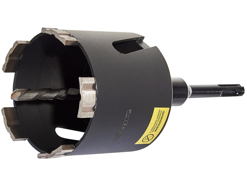 - Адаптер SDS+ з центруючим свердлом. Коронка поставляється з адаптером під стандартний патрон перфоратора SDS+. Центруюче свердло забезпечує точний початок свердління без "відведення" коронки вбік. Важливо пам'ятати: свердління проводиться *тільки* в безударному режимі!