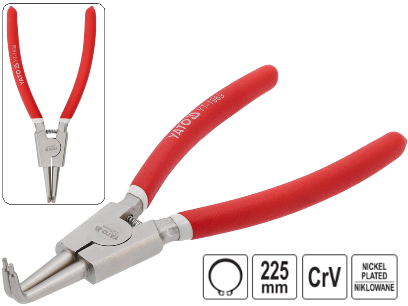 - Потужний важіль 225 мм. Щоб розтиснути велике і товсте стопорне кільце, потрібне значне зусилля. Довгі 225-мм рукоятки створюють необхідний важіль, дозволяючи вам контролювати процес однією рукою, в той час як поворотна пружина плавно зводить рукоятки.